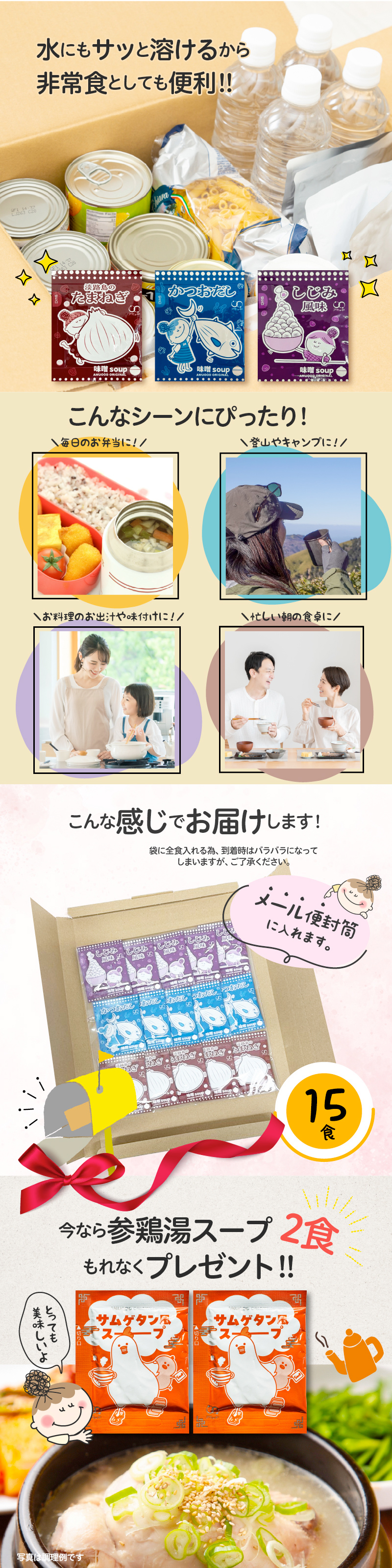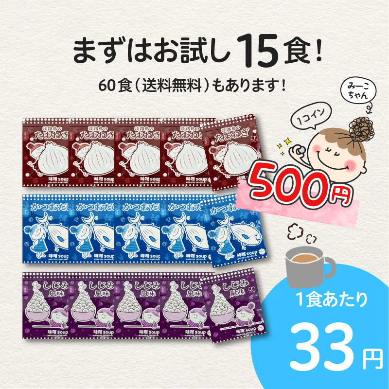 ・淡路島産たまねぎ味噌スープ 3.4g(1食) 5食 ・かつお味噌スープ 4g(1食) 5食 ・しじみ風味味噌スープ 4g(1食) 5食 |