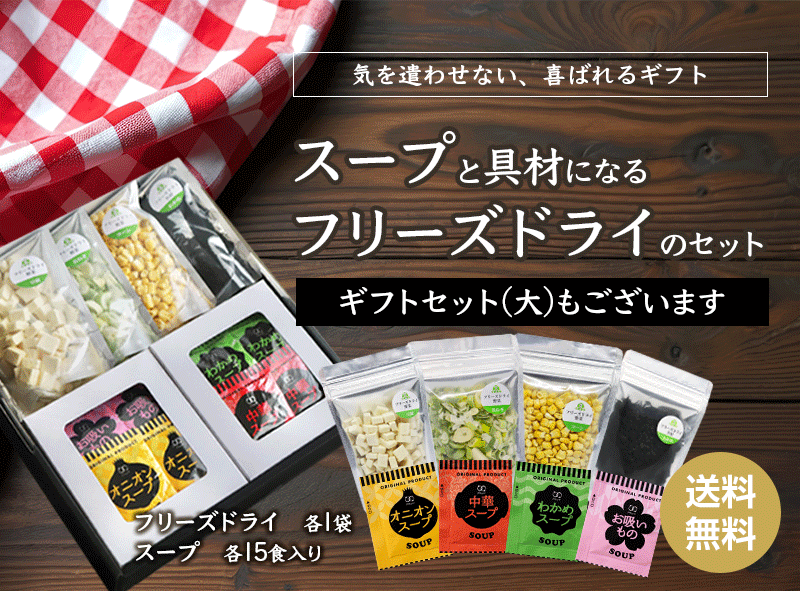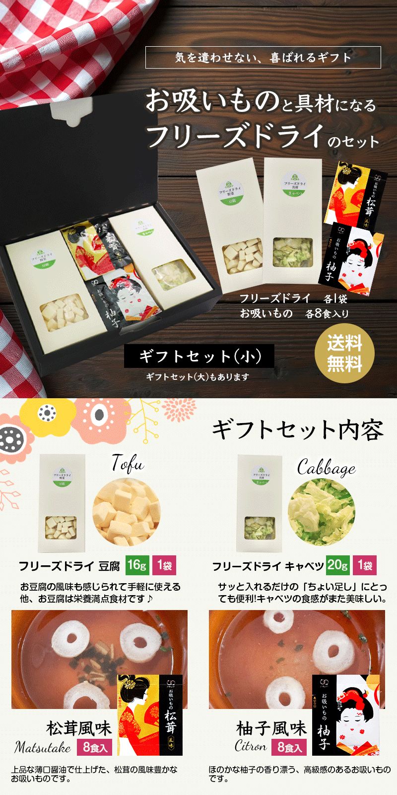 当店の人気商品をギフトセットにしました! フリーズドライ(豆腐・キャベツ)、お吸い物(柚子風味・松茸風味)のギフトセットです。 お歳暮、お祝い、ご挨拶、ちょっとした手土産に、気を使わせないお手軽にお渡しできるギフトとして、重さも軽いので外出先でも渡しやすくとても便利です。 |