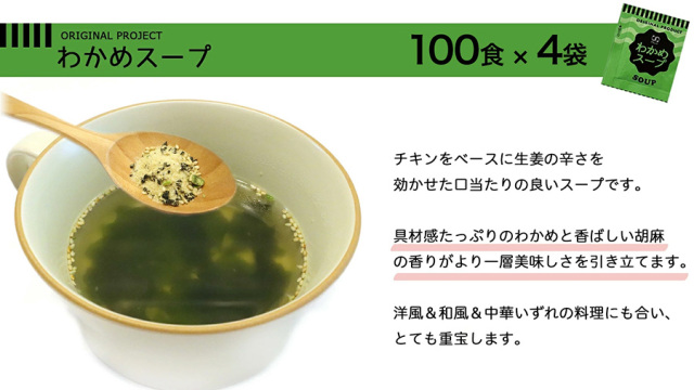 【商品説明】チキンをベースに生姜の辛さを効かせた口当たりの良いスープです。具材感たっぷりのわかめと香ばしい胡麻の香りがより一層美味しさを引き立てます。洋風&和風&中華いずれの料理にも合い、重宝します。